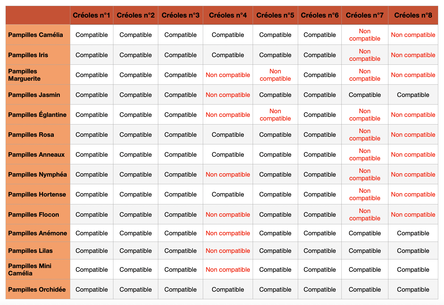 Tableau des compatibilités créoles-pampilles